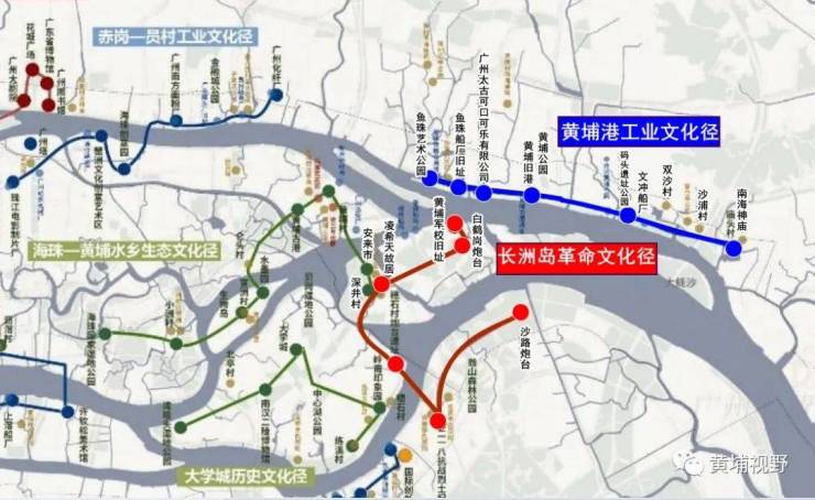 中心城区段策划新河浦红色文化径、沙湾岭南文化径、长洲岛革命文化径、黄埔古港-南海神庙海丝文化径、花城广场休闲文化径、广州西岸创新文化径、沙面-西堤历史文化径。