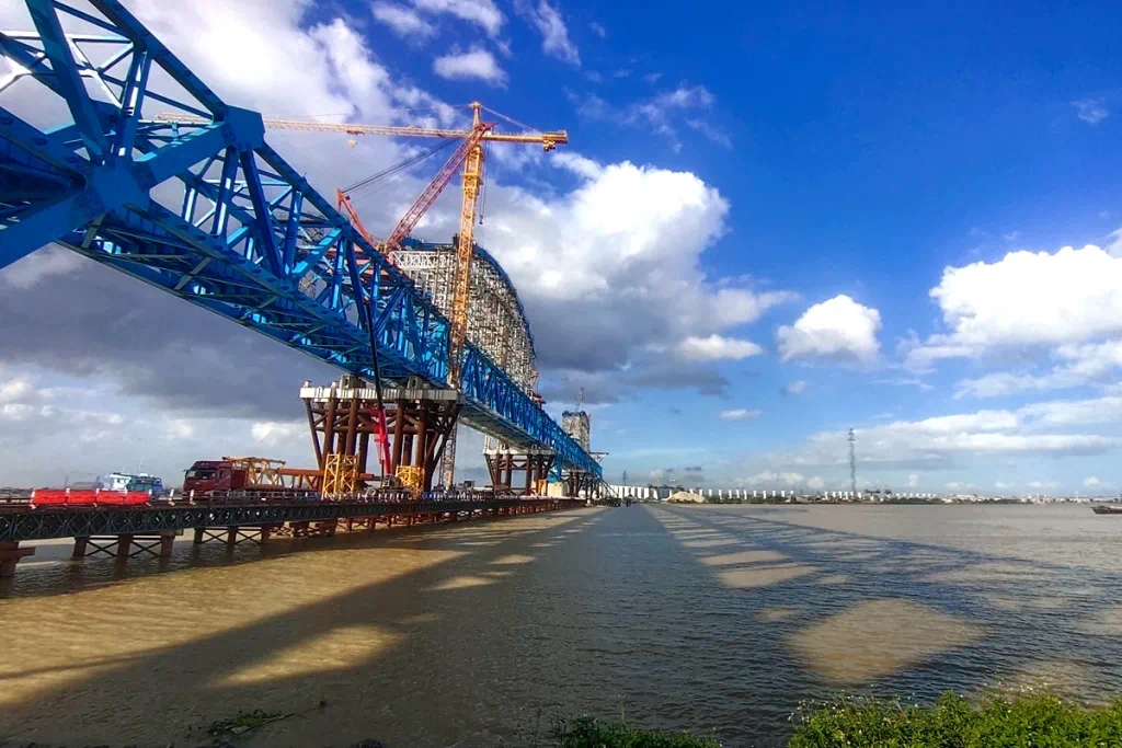 这也是国内首次在大跨度桥梁上采用板式轨道无道砟明桥面系,相比传统有道砟桥面,既减轻了桥面铺装的重量,全桥因此节省了用钢量17%,又避免了道砟飞溅,列车行驶过程中平顺性、稳定性更好,安全性更高,耐久性更好,使用寿命更长。