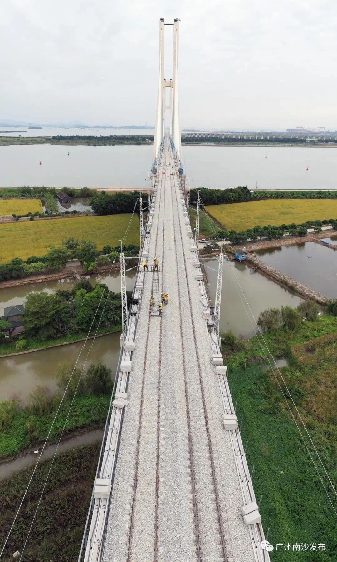 11月9日,随着最后一组钢轨安放到位,由中铁六局承建的南沙港铁路跨洪奇沥水道特大桥全线铺轨完成。