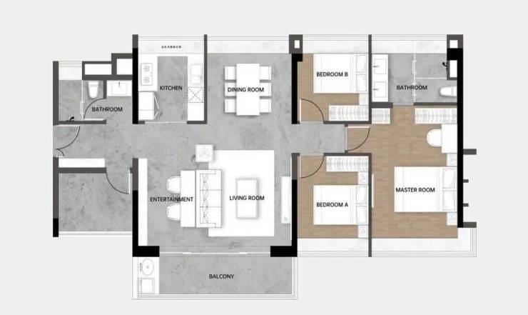 另外,该户型多个空间都带有飘窗设计,实用率高。