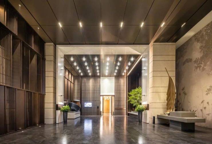 1)在公区打造上,新世界·天馥配置了与瑰丽酒店同源的双入户大堂,约10米挑高,气势非凡。