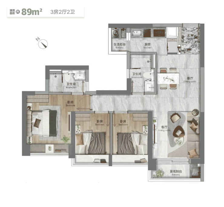 如建面约89㎡的三房户型,能做到四开间朝南,三个房间均能做到均衡,不会厚此薄彼。