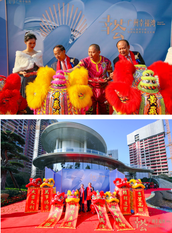 随后,陈凯旋董事长与卢汉坤总裁与一众领导嘉宾登台启幕隆重的剪彩仪式,红红火火、金灿金灿的礼炮与七色彩烟腾空而起,广州幸福湾启幕暨国际港湾幸福艺术周正式拉开帷幕!