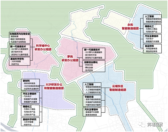 在产业上,云埔定位为以人工智能、高端装备、通信设备制造、节能环保为主的智能制造园区。依托云埔中心建设高能级成果转化中心,通过公共研究平台等不同的转化平台、中心,促进科技成果的转化以及科学城的智造升级。