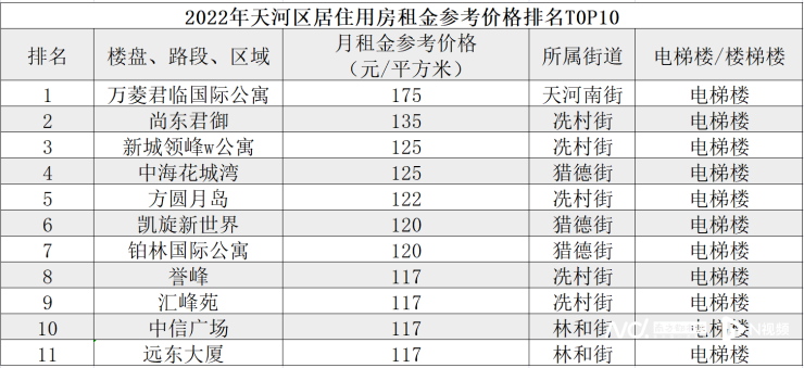 南都记者重点整理了天河区居住用房租金参考价格的前十位,这些小区当中,每平方米月租金都超过了115元。