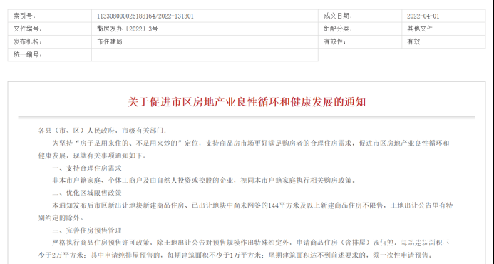衢州取消限购、优化限售、放松预售条件等。限售方面,针对144平方米及以上新建商品住房不限售,支持商品房市场更好满足购房者的合理住房需求。衢州成为排名前列个同时放松限购、限售的城市。