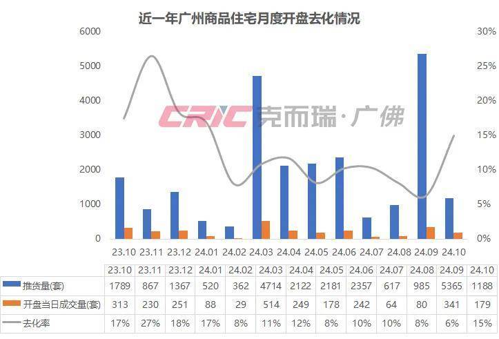 克而瑞数据监测显示,今年以来广州月度开盘(首开/加推)表现相对平淡,仅有1、7、8、10月开盘去化率在10%以上,其中10月全市推货套数环比大幅回落,受到黄埔大盘中建玖合·未来方洲低价首开入市带动,全市去化率升至15%,环比上升9个百分点。
