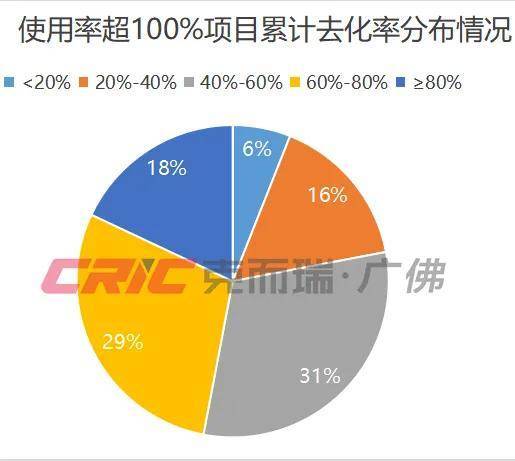 在这70个使用率超100%项目中,整体去化率中位数仅54.9%,去化率超60%的不足半数。以去化率以60%-80%和40%-60%范围的项目为主,占比分别为29%和31%。另有近22%的项目去化率不足40%。