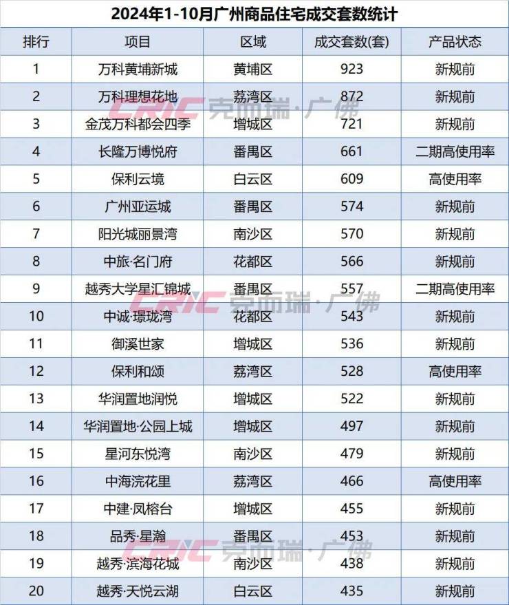 可以看到,在广州今年1-10月商品住宅成交套数TOP20排行榜上,涵盖“高使用率”产品的项目仅有5个,其余均为户型新规之前的项目。