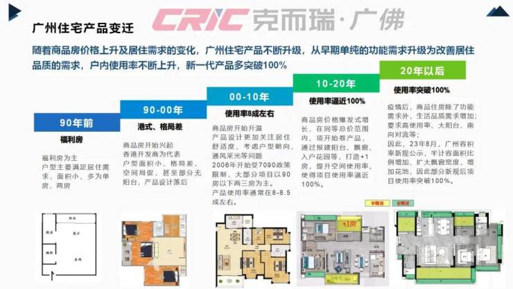 放眼广州, 随着商品房价格上升及居住需求的变化,广州住宅产品不断升级,从早期单纯的功能需求升级为改善居住品质的需求,户内使用率不断上升,新一代产品多突破100%。
