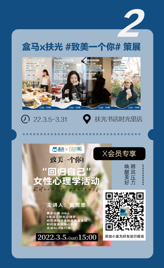 2 当盒马遇见扶光书店,当美食遇见精神粮食。盒马与扶光,不仅关心你的一日三餐,也关心你自己。3.4开始,盒马与扶光联合开展为期一个月的策展,如果你曾经陷入迷惘,在这个精神世界里,你总会找到答案。