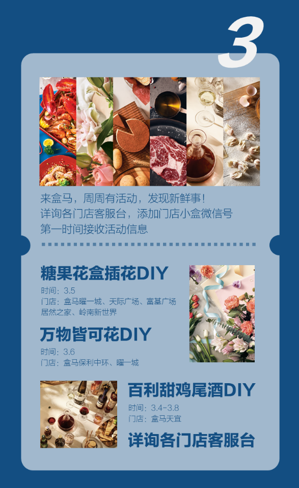 3 除此之外,盒马还有各类DIY活动,在各门店开启。想要更好玩转盒区生活,记得到客服台要下“小盒”的微信二维码,随时接收一手活动信息哦。