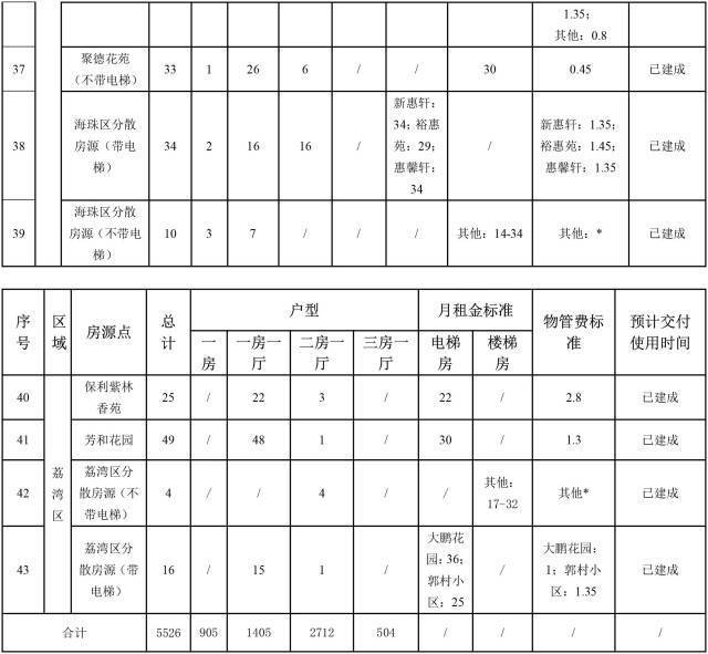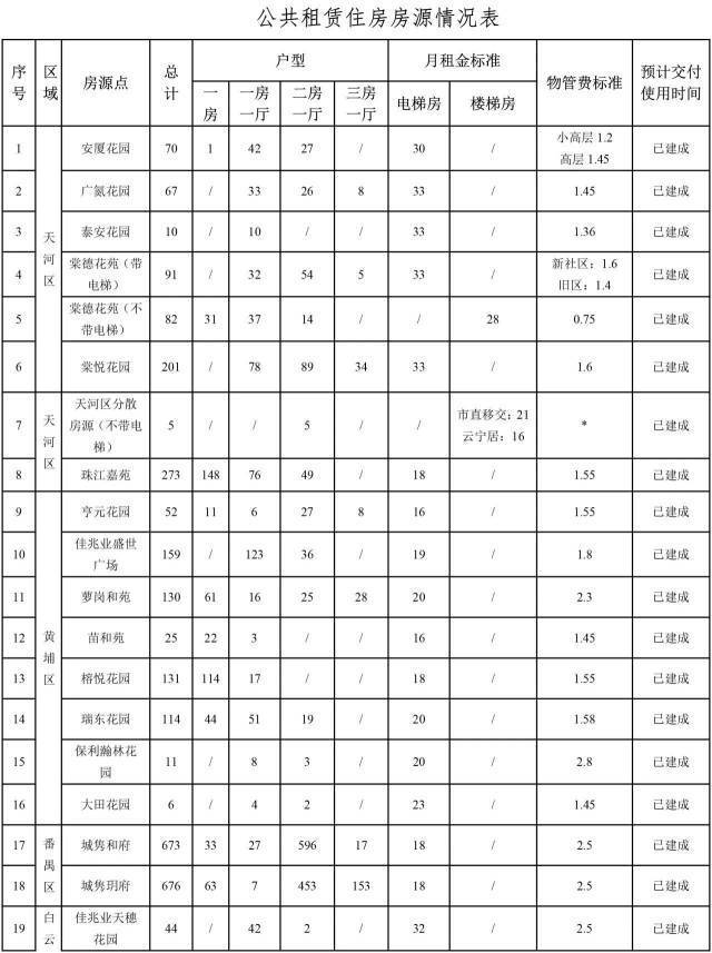 上述各房源租金标准、最新的物管费可查阅《广州市2023年户籍家庭公共租赁住房摇号分配指引》。物管费标准为*的房源为零星公租房,根据房源的实际情况支付相关费用。