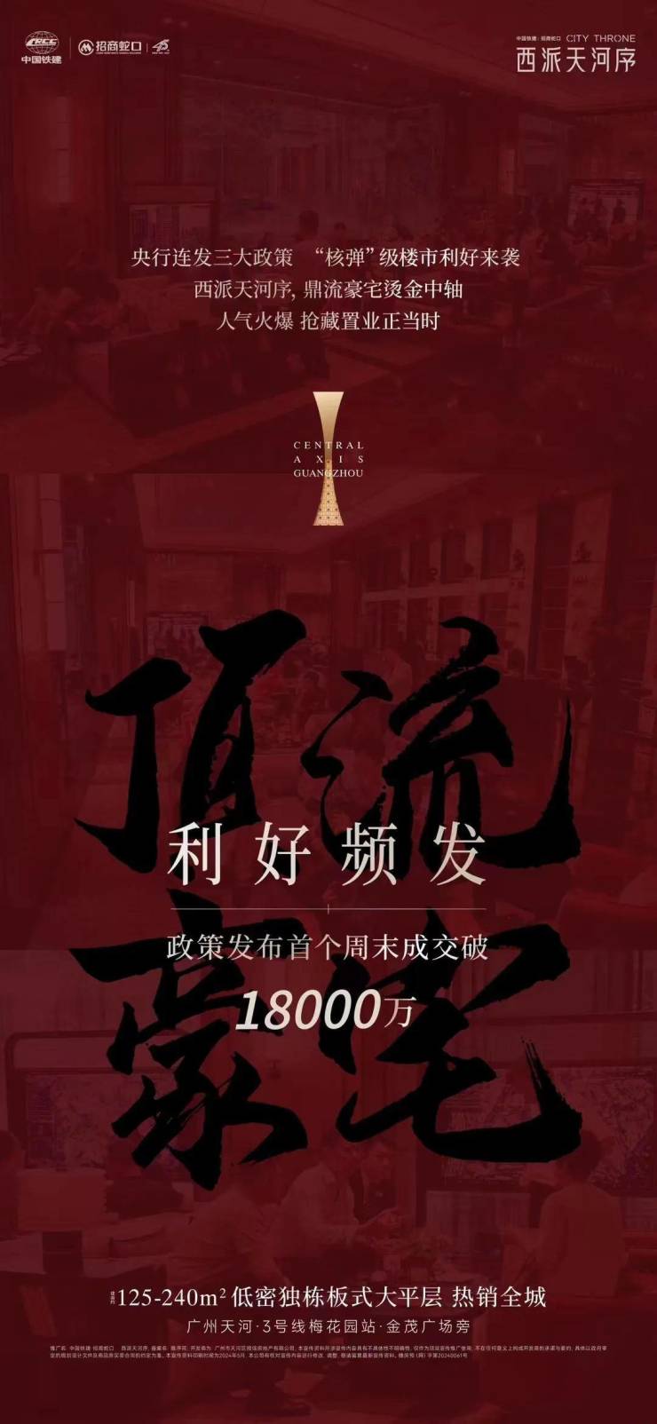 中国铁建招商蛇口·西派天河序发出喜报,新政后首个周末(5月18-19日),项目成交金额破1.8亿元。据悉,项目主推建面约125㎡、140㎡、180㎡和240㎡四个户型,并做到了全南向。产品力不会差,毕竟,“西派”属于中铁建的高端线,“序”属于招商蛇口的高端线。