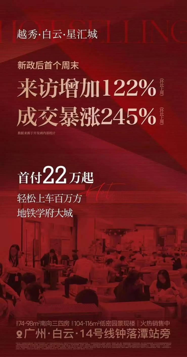 “超级大盘”越秀·白云·星汇城的热度也相当高。据项目发出的海报,新政后首个周末(5月18-19日),其客户来访量环比增加122%,成交量则上涨245%。项目现主推建面约74-116㎡三至四房,基本囊括各阶段的买家需求。