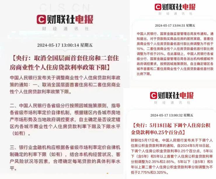 上周五(5月17日),央行一连发布三条重磅房地产新政,涉及取消全国层面首套住房和二套住房商业性个人住房贷款利率政策下限;下调公积金贷款的利率水平;首套住房商业性个人住房贷款最低首付款比例调整为不低于15%,二套住房商业性个人住房贷款最低首付款比例调整为不低于25%。