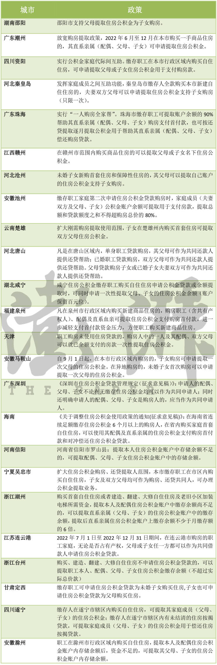 据澎湃新闻不完全统计,今年以来,至少包括湖南邵阳、广东潮州、四川资阳、河北秦皇岛、广东珠海、江西赣州、河北沧州、安徽池州、云南楚雄、河北唐山、湖北咸宁、福建泉州、天津、安徽马鞍山、广东深圳、海南、河南信阳、宁夏吴忠市、浙江湖州、江苏连云港、浙江台州、甘肃定西、四川遂宁、安徽滁州等20余个省市发布公积金贷款新政,多地在政策中提到,子女购房可提取父母公积金,实行“一人购房全家帮”。以四川遂宁为例,9月5日,四川省遂宁市住房和城乡建设局发布《遂宁市主城区进一步促进房地产业平稳健康发展的政策措施》政策解读。《措施》显示,实施住房公积金阶段性支持政策,缴存人在遂宁市辖区内购买自住住房,可提取其家庭成员(父母、子女)的住房公积金;缴存人在遂宁市辖区内有未结清的住房按揭贷款,可提取家庭成员(父母、子女)的住房公积金用于偿还住房按揭贷款。
