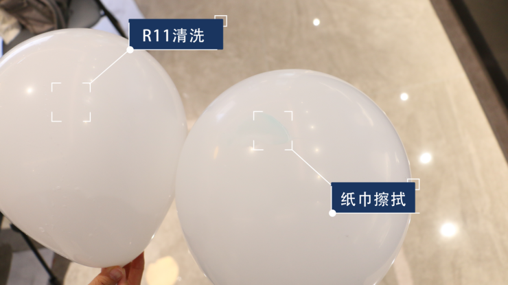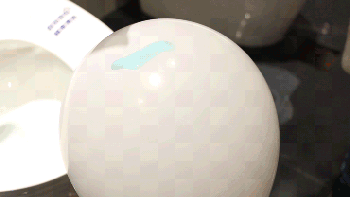 我们在两只白色气球上涂抹蓝色牙膏,同样静置十分钟后,一只气球直接用纸巾擦拭,可以看到仍有残留;另一只气球则置于臀洗模式的水柱下,30秒不到,这只气球已恢复洁净。可见,R11快速冲净的清洗表现也同样优异,值得推荐。