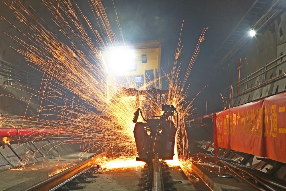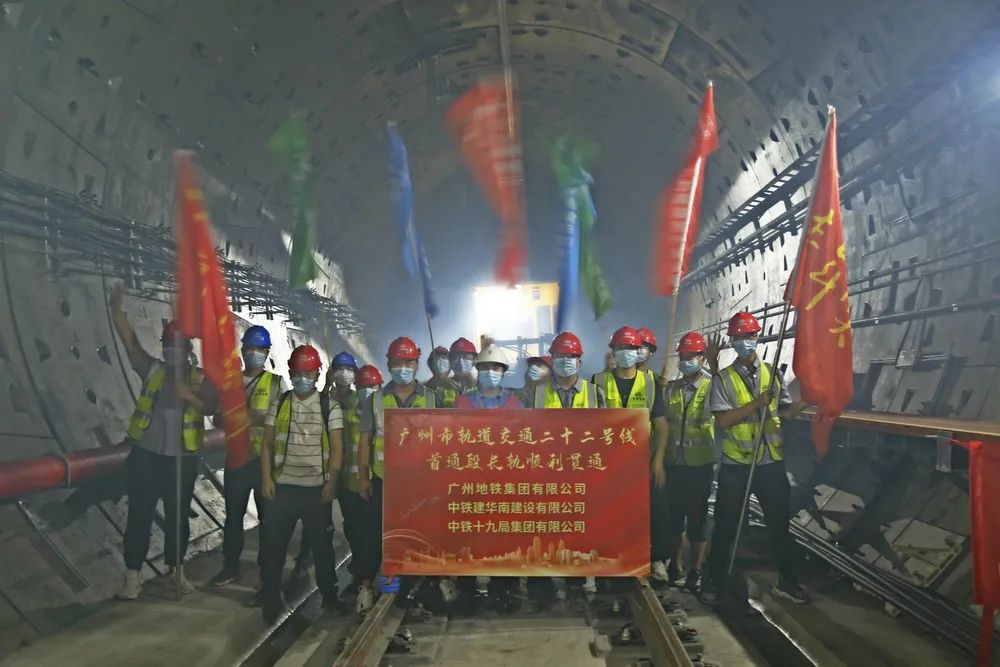 地铁二十二号线首通段(番禺广场至陈头岗)全长18.2公里,全段共有钢轨焊接接头2900多个。广州地铁及施工单位中铁建华南公司广州地铁二十二号线一分部(中铁十九局管段)的建设者们齐心协力,累计投入141台混凝土运输车、8台轨道车、27台铺轨机等设备,高峰期共有720人同时作业,在严格执行相关工艺流程的基础上,平均焊轨进度达到500米/天,单日较高焊轨1.2公里,有效保障了施工进度。