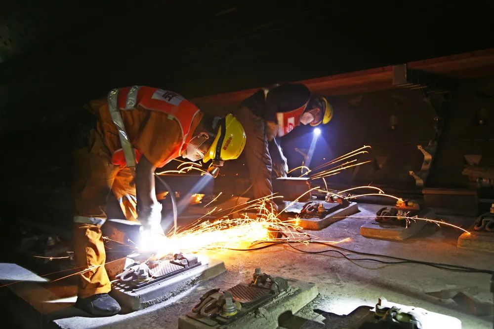 △ 施工人员对轨道进行打磨除锈 陈虎辉/摄