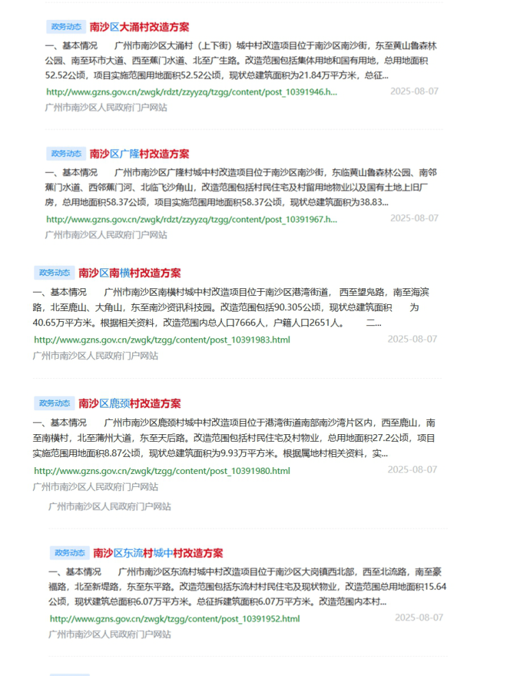截至今年二季度,南沙共有17个项目确认主体,本季度东流村改为做地模式,同时公示基础数据调查及结果;金洲、冲尾村-升龙臻府纳入《南沙开发区(自贸区南沙片区)、南沙区2025年重点建设项目计划》计划中;亭角村、大井村发布征地公告。
