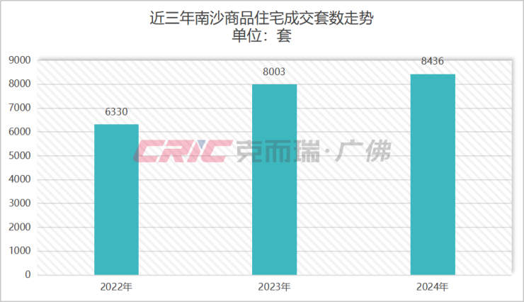 克而瑞数据监测显示,2024年南沙商品住宅成交8436套,为近三年来的最高规模。