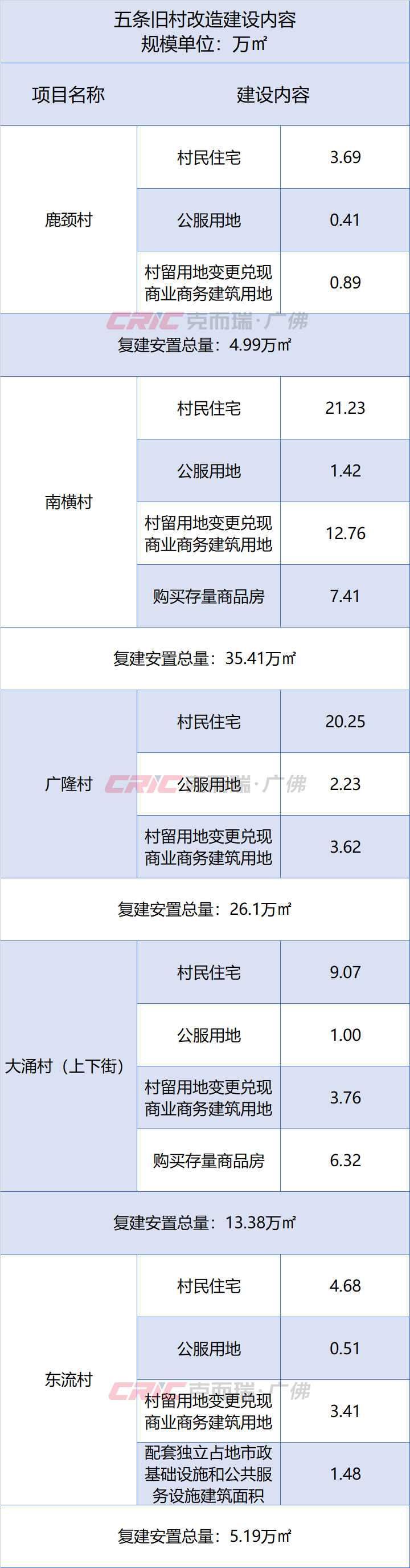 在建设内容上,与其他村不同,南横村与大涌村(上下街)均提出了购买存量商品房进行安置的内容,其中南横街购买规模为7.41万㎡,大涌村(上下街)为6.32万㎡。