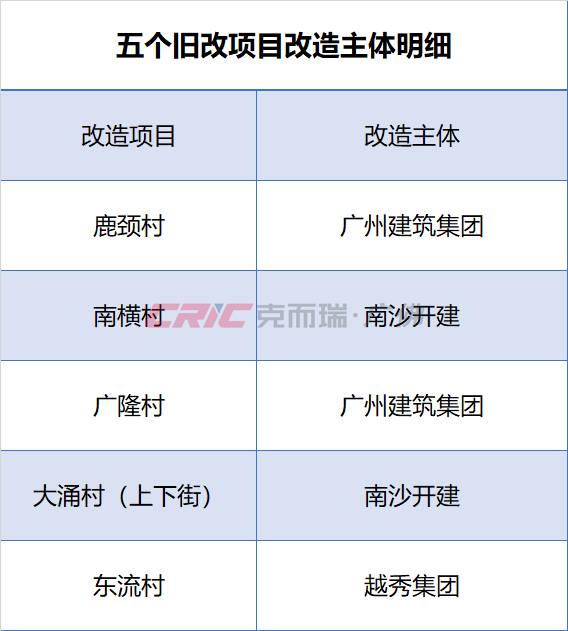 改造方案上同步公布了五个改造项目的改造主体,南横村与大涌村(上下街)的改造主体为南沙开建,鹿颈村与广隆村的改造主体为广州建筑集团,东流村则为越秀集团。