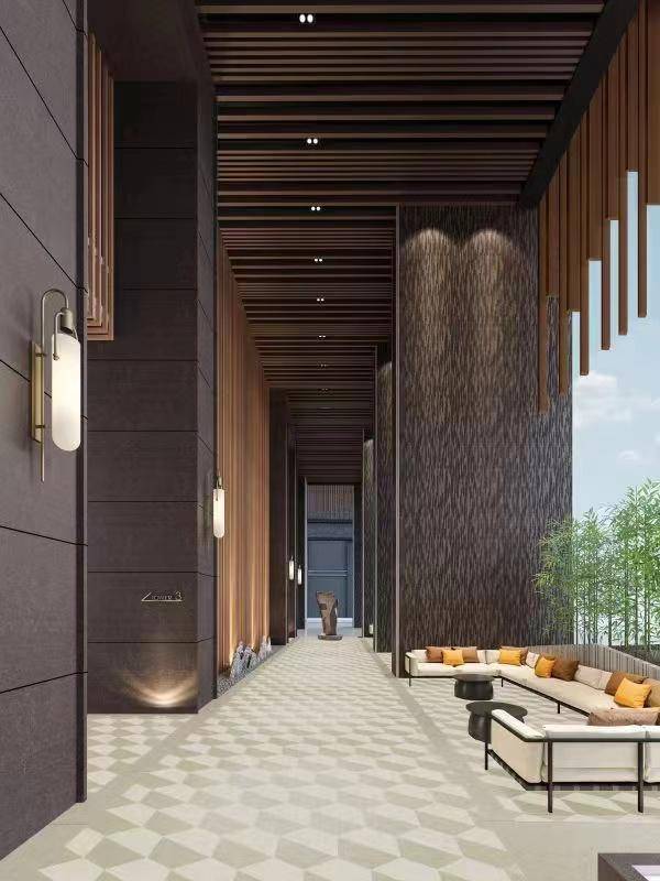 近10米挑高的入户大堂气派非凡,自然木色与奢华的金属色在空间中碰撞,构筑温暖与冷静的平衡;休闲椅、矮脚茶几与绿植,品质感和精心的配色营造出雅致的格调感,形成由审美带来的愉悦感。