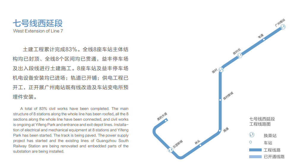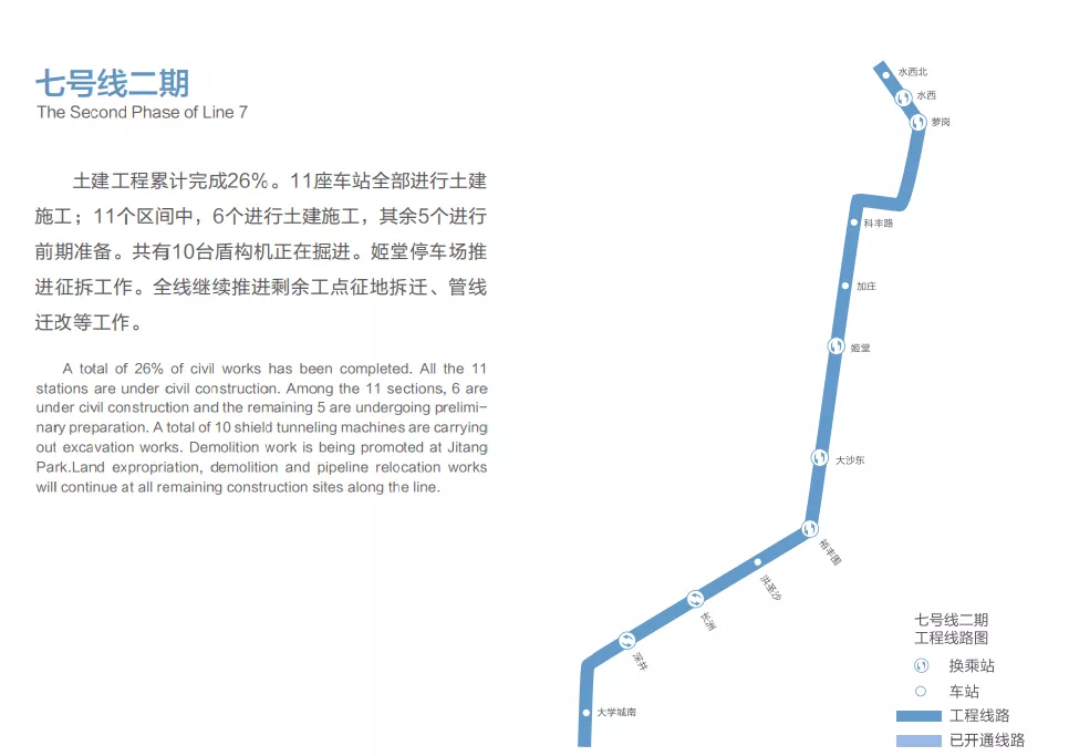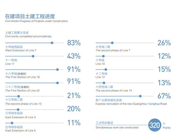 11条在建新地铁线(段)土建工程进度中,22号线(首通段)、18号线(首通段)进度超前,均已达91%;其次为7号线西延段,进度达83%。按照计划,这3条线路(段)将于今年年内开通。