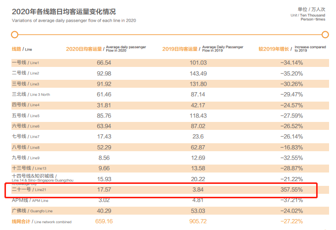 如上图所示,2020年21号线日均客运量达17.57万人次,相对比2019年(3.84万人次)增长了 357.55%。