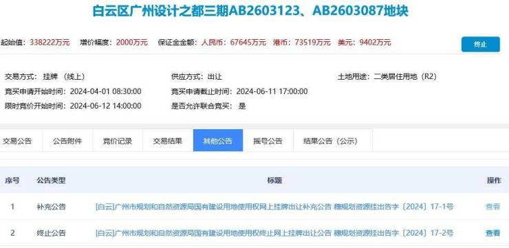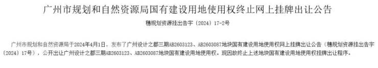 日前,广州公共资源交易中心发布公告,原定于今日(6月12日)竞价出让的广州设计之都三期AB2603123、AB2603087地块因故终止出让。