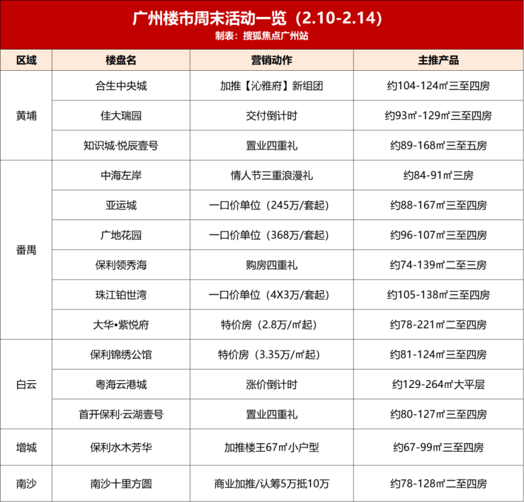 聚焦到本周(2.11-2.14),在搜狐焦点不完全统计的14盘中,广州东王炸盘——保利水木芳华加推楼王单位67㎡小户型、270万㎡超级大盘——合生中央城加推【沁雅府】新组团以及各盘应情人节推出的各种优惠活动......很热闹,一起来看!