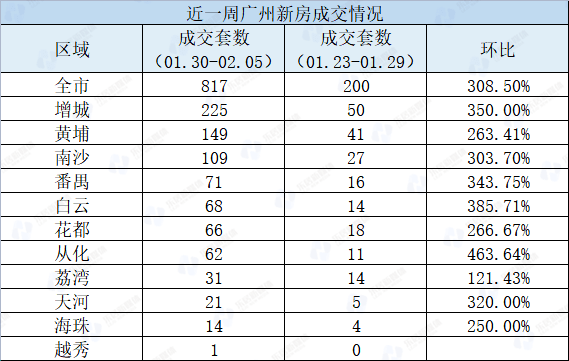 据阳光家缘数据显示,上周(1.30-2.5)广州新房成交量环比增长了3倍不止。