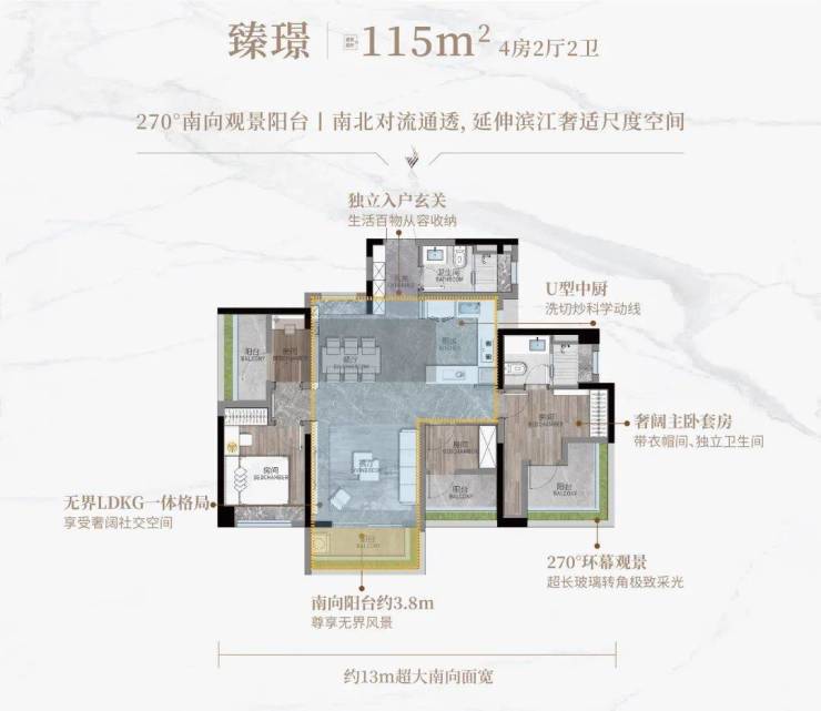 建面约115㎡四房产品打破了传统的户型布局手法,在保证四开间朝南的情况下,将面宽拉升到约13米,让居住空间更加开阔通透。光是客厅的面宽做到约3.8米,所感受到的尺度舒适,远超市面上140平户型。