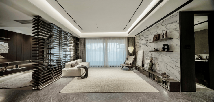 客厅背景墙选用定制水纹大理石岩板,地砖采用希尔顿酒店同款的“简一”高奢大理石瓷砖,毫米级铺贴工艺,保证如一整块石材般平整统一。