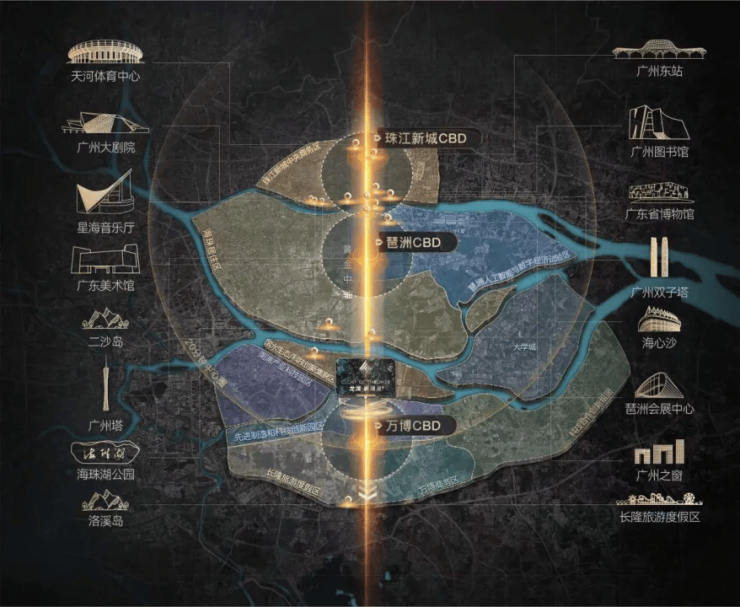 随着城市发展,中轴上的珠江新城、琶洲、万博三大CBD已紧密融合。龙湖·御湖境手握万博CBD高能级资源,距珠江新城直线约9公里,20分钟中心圈,生活方面自有万般缤纷。