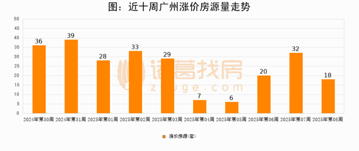 从调价房源来看,第8周广州涨价房源18套,较上周下降43.8%。与此同时,8周涨价房源占比回落4.83个百分点,业主信心小幅波动,购房者可则需入市。