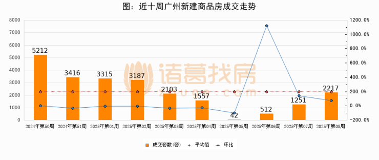 进入2025年第08周(02月17日-02月23日),广州新建商品房成交2217套,较上周增加966套,环比上涨77.2%