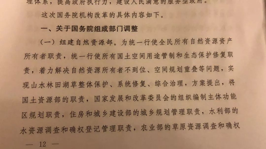 另外,国家发改委的组织编制主体功能区规划职责,住建部的城乡规划管理职责,水利部的水资源调查和确权登记管理职责,原农业部的草原资源调查和确权登记管理职责,国家林业局的森林、湿地等资源调查和确权登记管理职责,国家海洋局的职责,国家测绘地理信息局的职责,将整合划归自然资源部。