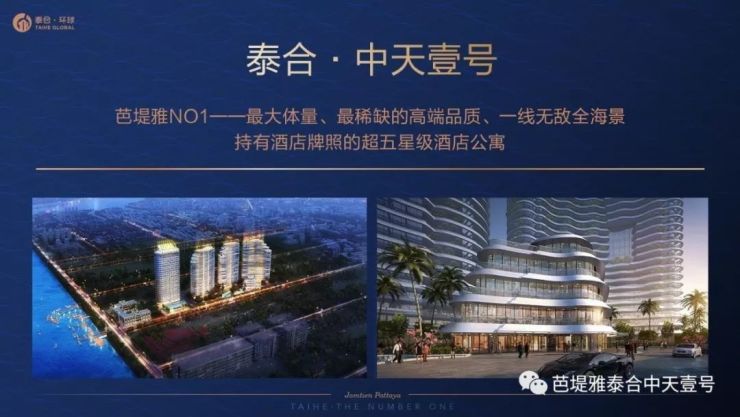 芭堤雅·中天壹号——地处芭堤雅中天海滩,零距离亲海,将开阔的海滩纳为私享,中天壹号巨资打造观海综合体,项目规划五星级酒店公寓、商业楼下将建设大型(商场及超市)为一体的商业综合体,24小时水疗中心、泳池、会所等,由全球知名的仲量联行物业管理,英式管家服务。