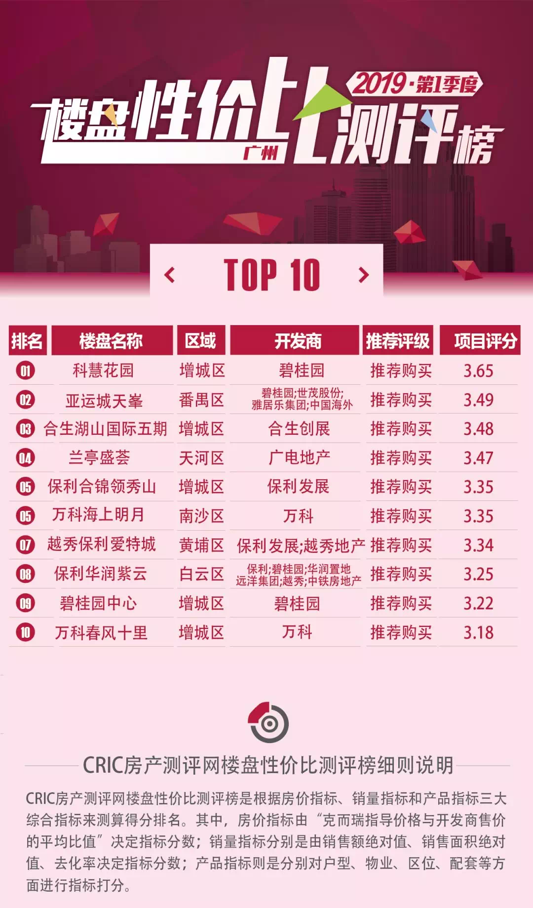 CRIC房产测评网从房价、销量、产品三大维度对广州楼市一季度推新楼盘进行评定,评选出10个性价比较优的楼盘。本次上榜的十盘,有5盘来自增城区,天河、白云、黄埔、番禺及南沙各一盘,外围六区整体占据8盘。值得注意的是,科慧花园、亚运城天峯、合生湖山国际、保利合锦领秀山、万科海上明月、越秀保利爱特及保利紫云等七盘在价格方面有明显优势,比周边楼盘或项目早期单位价格低。