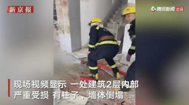 视频显示,一栋楼的二层内部严重受损,有柱子、墙体倒塌,有人员受伤倒地。公安、消防和急救人员已到场处置。