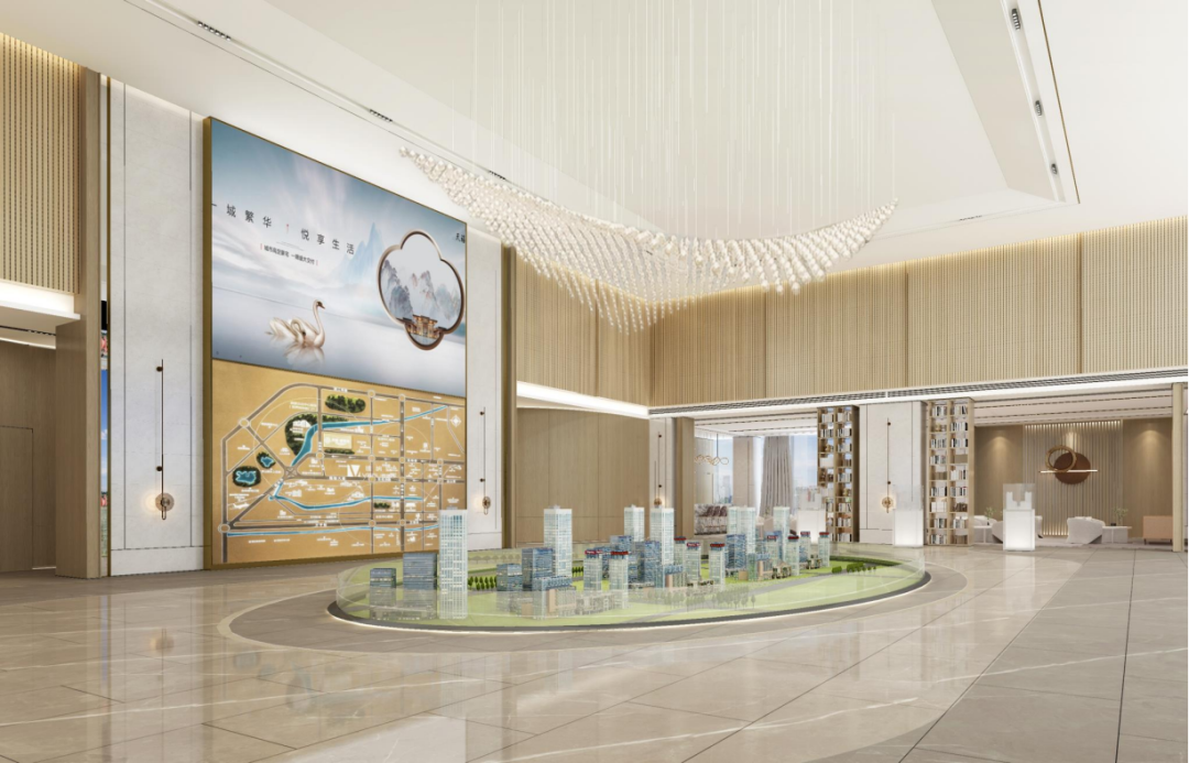 而即将亮相的项目营销展厅内部则主打新东方风格,其特点主要为富有中国传统文化色彩的背景,整体对称,空间充满层次感,线条简洁明朗,将传统风的繁琐用简约的现代风来代替,将两者的元素融合在一起,体现出中国传统的神韵,简约的现代设计风。