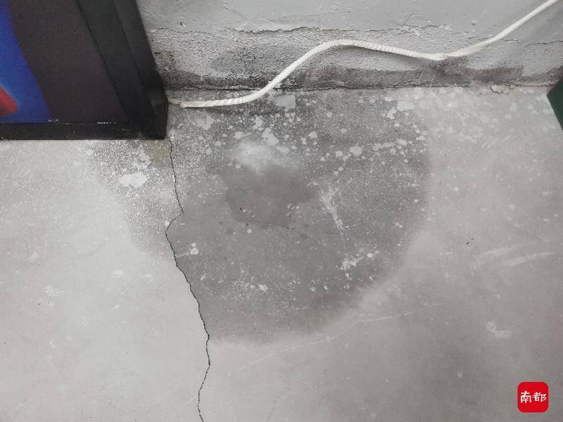 陈女士经营着一家熟食店铺。记者走进该店,她指着天花板称,昨夜凌晨下了一阵雨,雨水渗透到天花板,现在仍然滴着水。记者此时看见,厨房区域的天花板有几处肉眼可见的细缝,生成的水滴附着在细缝周围,蔓延至墙面也被浸湿,底下放置着几个水桶,接着往下掉的水滴。此外,墙身处也有部分浸湿,地板留下一片片水渍,“客人看见我这里噼里啪啦地漏水,肯定也不愿意来这吃饭呀。”