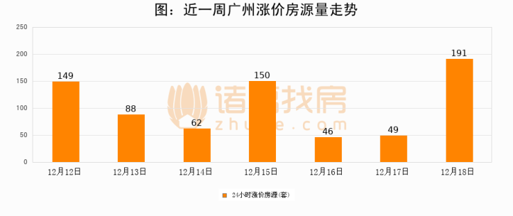 根据诸葛找房数据显示,广州24小时涨价房源量为191套,较12月17日增加142套,环比上涨289.8%。与此同时,涨价房源占比小幅扩大,业主信心有所提升。