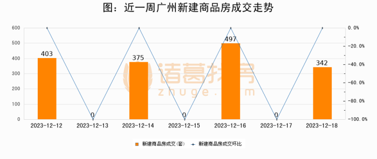 根据广州市住房和城乡建设局数据显示,2023年12月18日广州新建商品房成交342套,较昨日增加342套,环比上涨0%