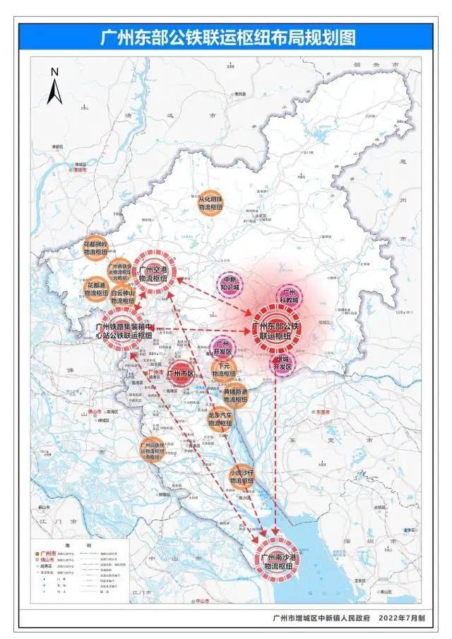 摊开地图便可发现,中新位于广河高速、珠三角环线高速(北三环)、花莞高速、增天高速(新建)、增莞番高速(新建)、广惠高速等6条高速公路网环绕的腹地,紧邻铁路东北货车外绕线,坐拥广州东部公铁联运枢纽、增城西站货场。