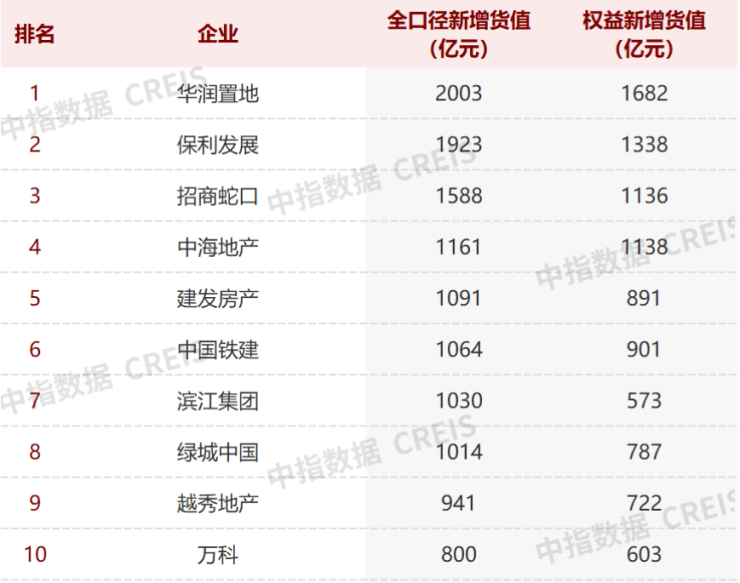 从新增货值来看,今年前10月全口径新增货值榜单前三位被华润置地、保利发展和招商蛇口占据,分别为2003亿元、1923亿元和1588亿元。TOP10房企1-10月新增货值总额12616亿元,占百强企业36.1%,TOP10新增货值门槛为800亿元。