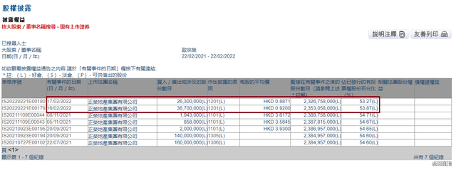 据香港联交所信息,正荣地产大股东欧宗荣上周出售6300万股股份,套现5709.47万元。股权披露资料显示,欧宗荣分别于2月16日和17日在场内出售3670万股和2630万股股份,平均价每股为0.92港元和0.8871港元;其持股比例由54.71%下降至53.27%。